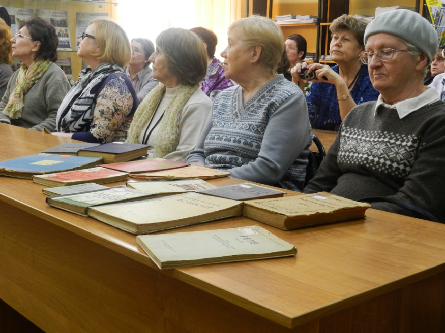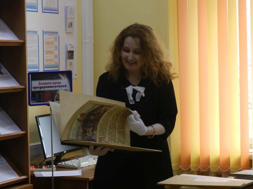 После небольшой экскурсии по зданию в одном из залов главный библиотекарь фонда редкой книги Елена Сердитова рассказала о редких книгах и библиотечных «чистках», которые, по ее словам, после революции 1917 года приняли характер библиоцида.