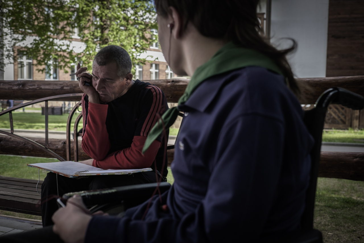 «Вижу ее, она говорит: «Ой, Женя, как дела у Вити?» Да ты зайди, прошу ее, вот он, рядышком. Дома сидит, никуда не убежит. Родным дела до нас нет. А вот им, — Женя кивает на волонтера фонда «МойМио», которая болтает с Витей в отдалении, — почему-то есть. Не знаю, почему».