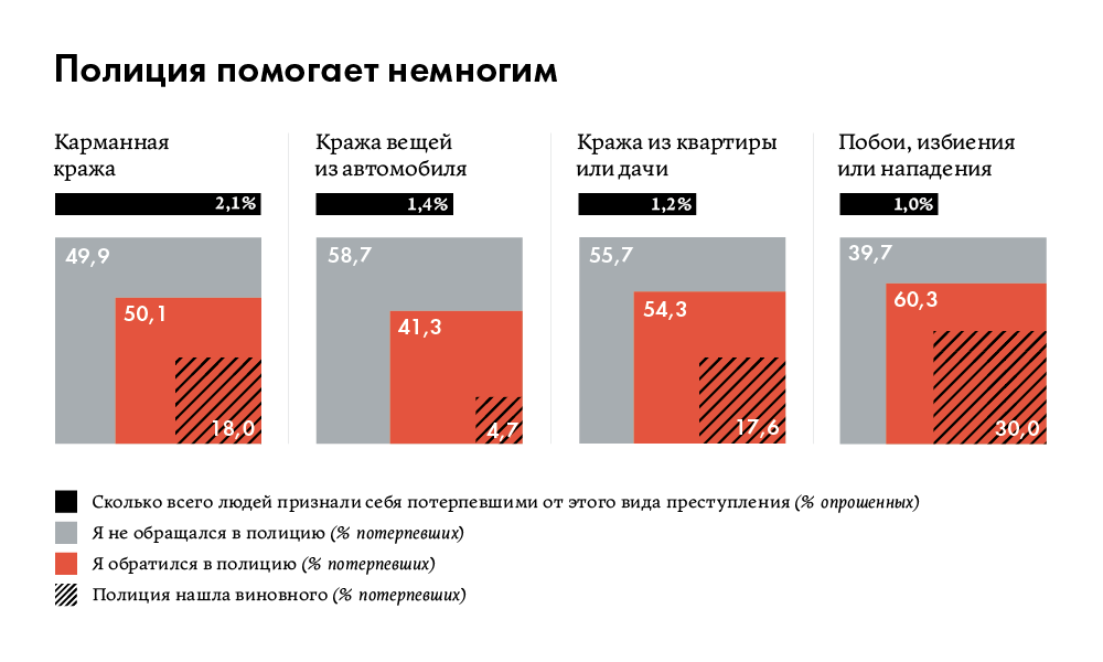 Сколько таких «довольных»? Об этом знает только МВД, по заказу которого каждый год опрашивают до 60 тысяч человек, — но результатами министерство с обществом не делится. В конце 2016 года по заказу Высшей школы экономики и Центра стратегических разработок был проведен большой всероссийский опрос (6062 человека), в котором, в частности, респондентов спрашивали, случалось ли им стать жертвами краж или насильственных действий в течение последнего года, обратились ли они по этому случаю в полицию и был ли полицией найден виновный.