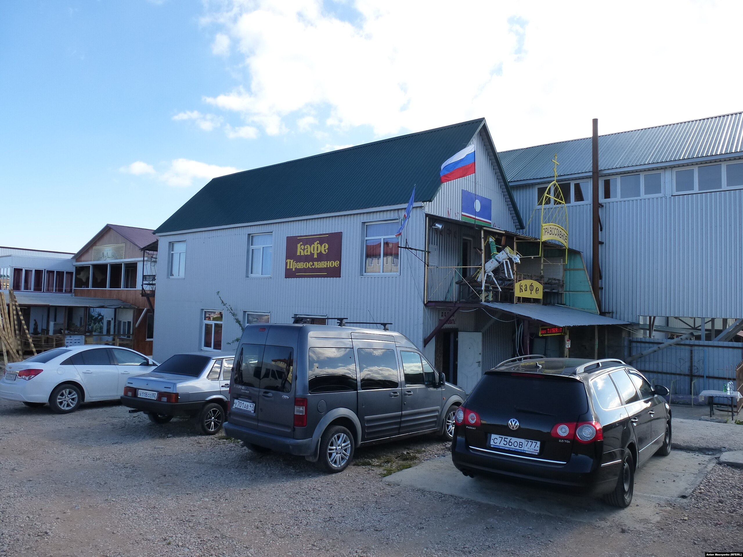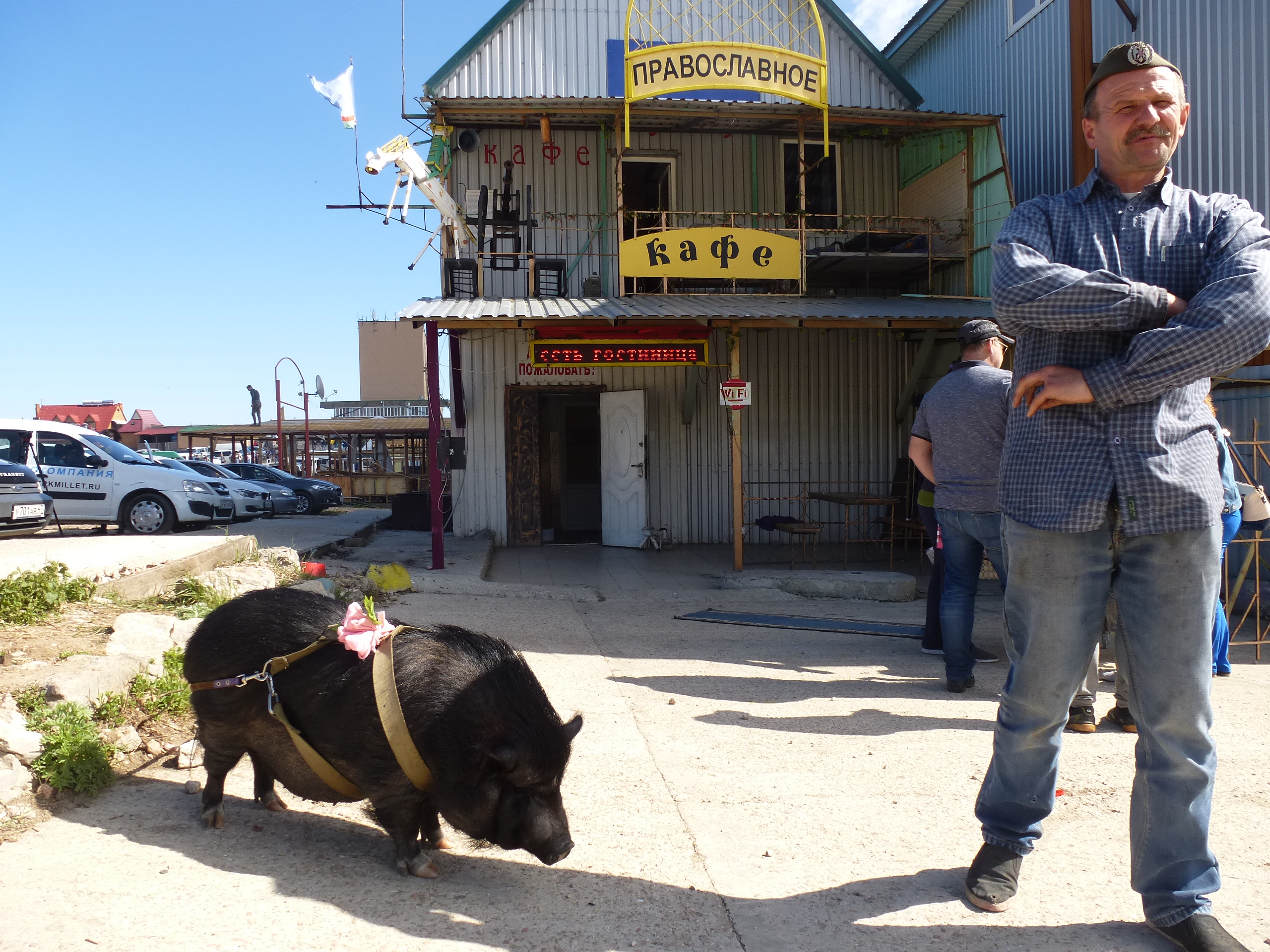 Лямин один из немногих русских, работающих на Ай-Петри. Свою закусочную он представляет как "православное кафе". Маркетинговые атрибуты у заведения соответствующие: стилизованный металлический купол с крестом над входом, надписи "Славяне" и "Работаем без зазывал" в бегущей строке, опять же свинья, которую в мусульманском кафе представить немыслимо.