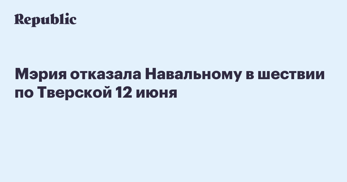 Власти Москвы отказались согласовать шествие 12 июня по Тверской улице, заявку на которое подал Алексей Навальный. Об этом «Интерфаксу» сообщил глава департамента региональной безопасности Москвы Владимир Черников.