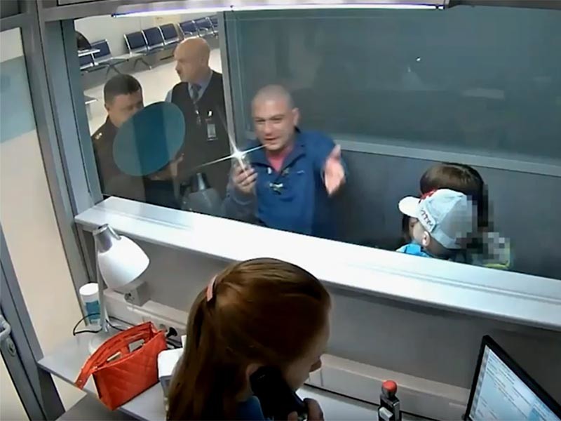 Судя по записи, глава семейства, недовольный долгим стоянием в очереди, сперва отпустил несколько гневных комментариев в адрес сотрудницы погранслужбы, в частности обозвал ее "мышью позорной", потом принялся угрожать ей и появившимся сотрудникам полиции, а затем попытался сломать дверь, чтобы его семья могла пройти на посадку.