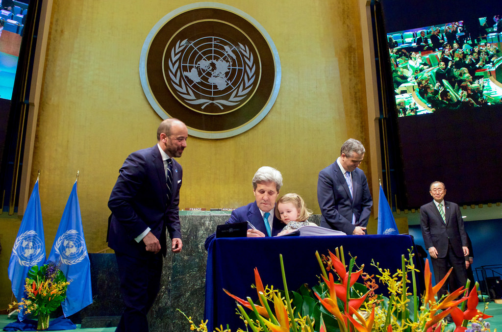 Госсекретарь Джон Керри подписывает соглашение по климату 22 апреля 2015 State Department photo/ Public Domain Трамп говорит, что благодаря этому отказу в США теперь воспрянет угледобыча. Но это абсурдный аргумент, считает автор, потому что проблема угля в том, что ему приходится конкурировать с дешевым и изобилующим природным газом. Но даже если счесть его разумным, то США всё равно могли бы с легкостью сократить выбросы до предполагавшихся стандартов к 2025 г. и без ужесточения ограничений по угольному отоплению.