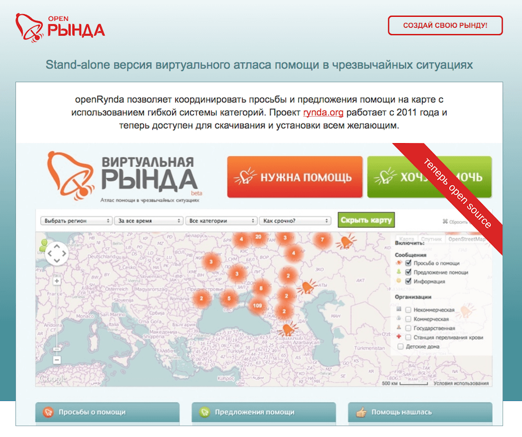 Платформы, которые легко запустить, также могут повысить вероятность эффективной самоорганизации людей в ситуации кризиса. Именно поэтому в свое время сработала «Карта помощи», которая базировалась на платформе «Ушахиди», позволившей создать волонтерский онлайн-проект в считанные часы. Подобный ход мысли мотивировал и превращение платформы «Виртуальная Рында» в платформу «Открытая Рында», которая позволяет каждому создать свой портал координации взаимопомощи. Однако, как показывает опыт, существование доступных технологических решений не гарантирует эффективности их работы.