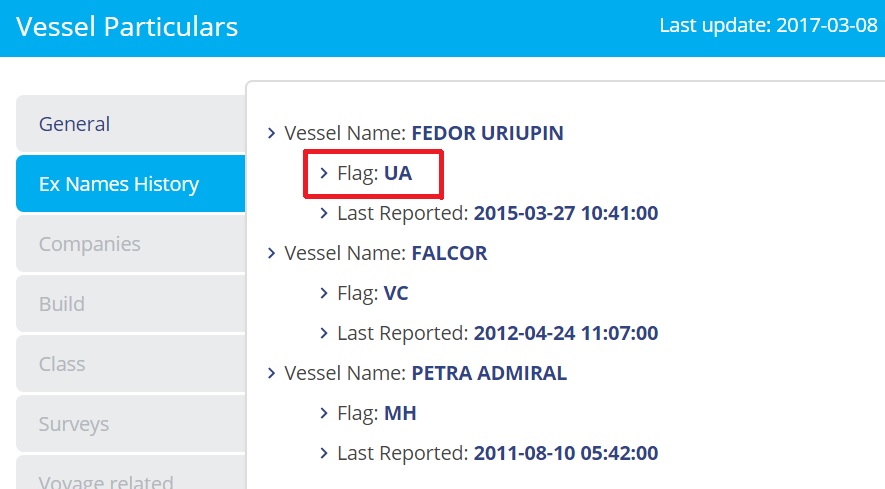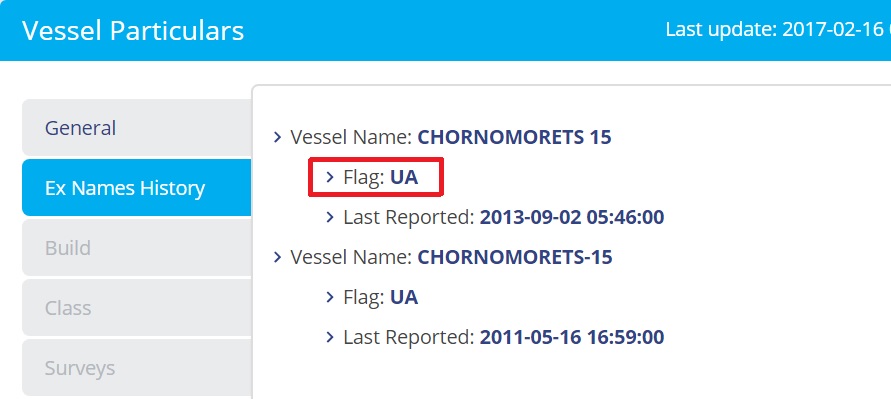 О том, что изначально судно было украинским, можно увидеть в отдельной вкладке – об истории судна.