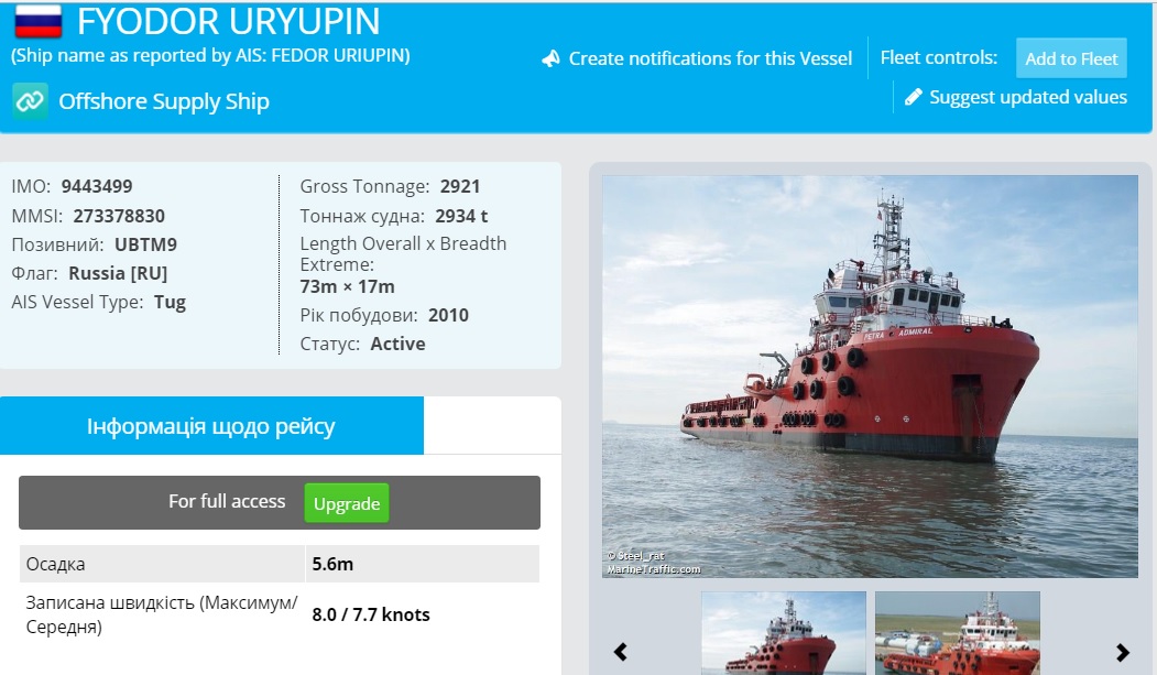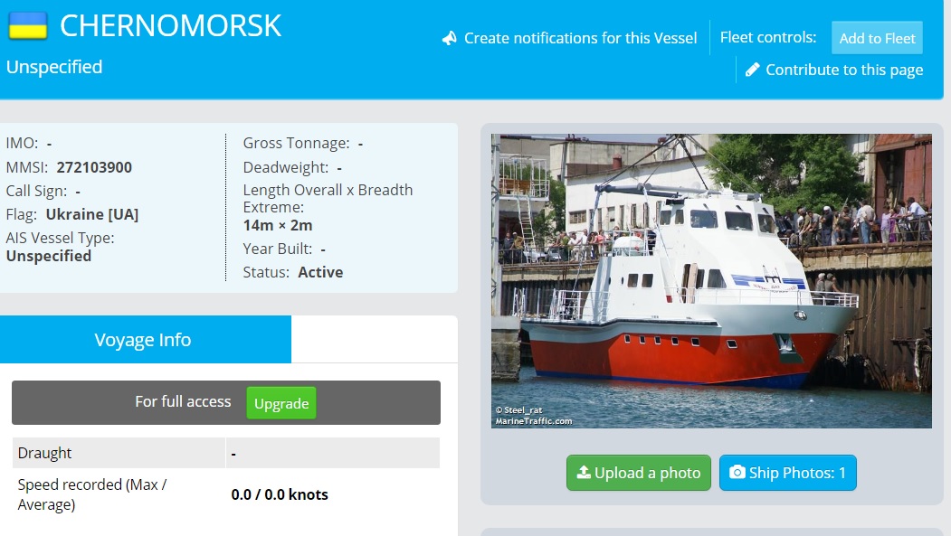 К примеру, арестованный буксир «Федор Урюпин», который находится в порту «Черноморск», указан здесь как российское плавсредство.