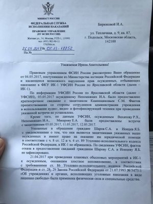 В письме говорится, что Непомнящих было предоставлено свидание с защитником Каменщиковым, а Шаров и Ионцев не были допущены к своим подзащитным, потому что от них попросту не поступало заявления о том, что они являются защитниками заключенных и желают оказать им юридическую помощь.