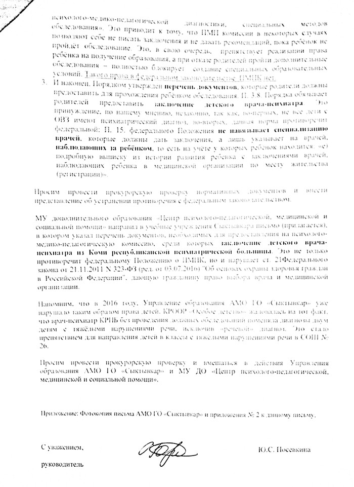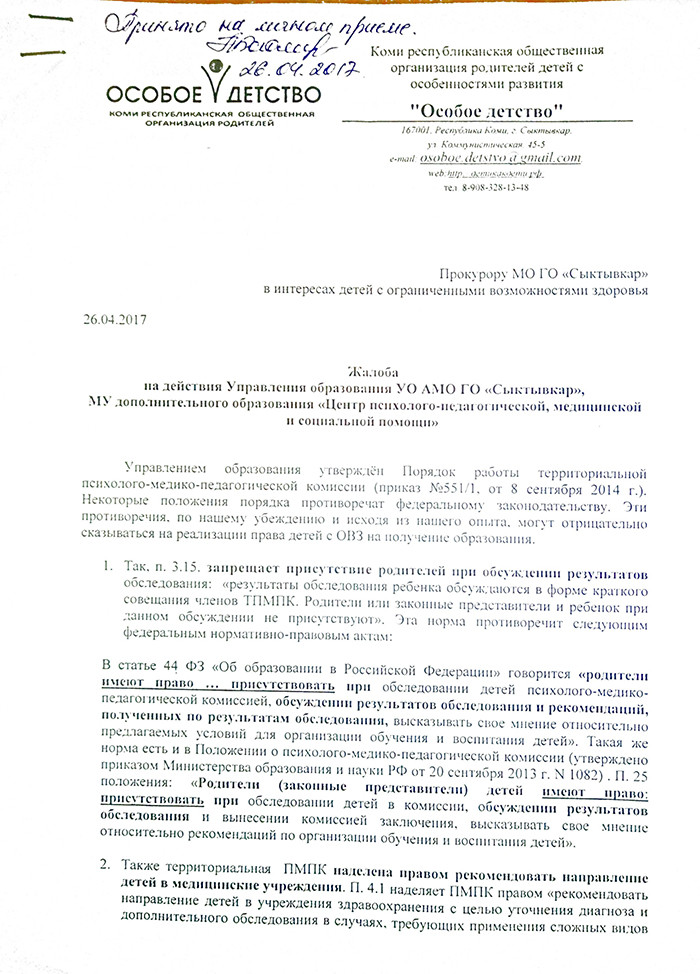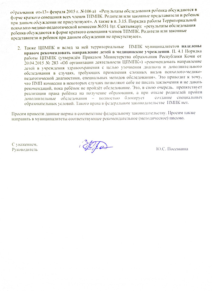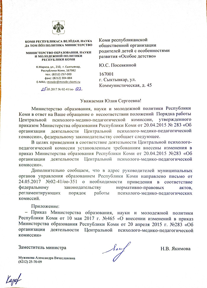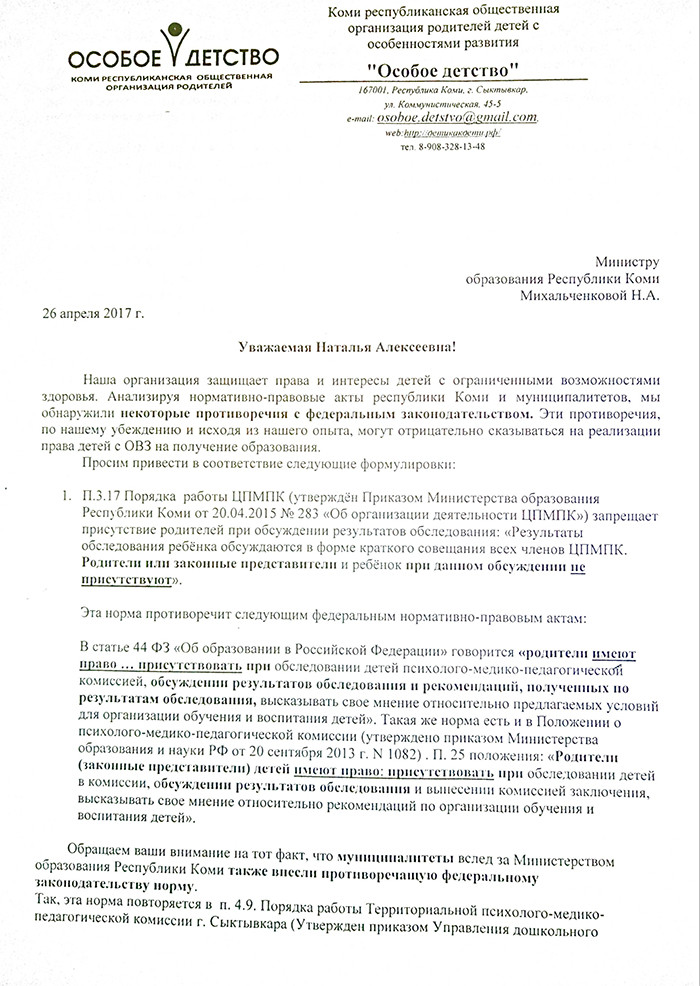 26 апреля руководитель «Особого детства» написала письмо в Министерство образования и науки Коми, в котором также указала на несоответствие регионального и федерального законодательства.