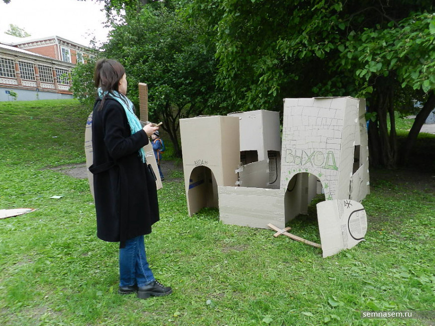 Напротив стенда для лучников возвышался сооруженный из картонных коробок старинный замок. Дети изучали «внутренние покои», сталкивались друг с другом и смеялись. Волонтеры ЭРА Настя и Алина поддерживали хлипкую конструкцию, закрепленную скотчем. Они пояснили, что это за объект: он призван привлечь внимание к необходимости переработки любого мусора, в том числе картона.