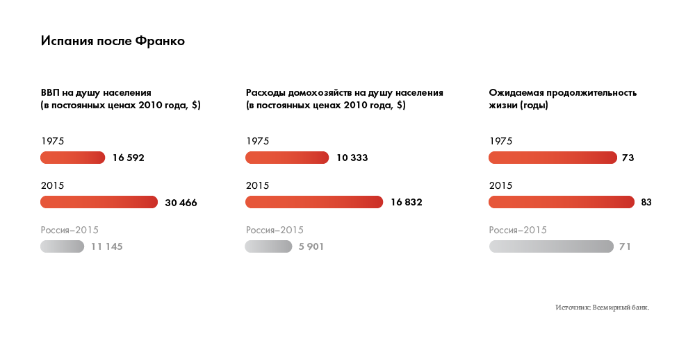 Мадрид. Скульптуры Франко во время митинга памяти бывшего испанского диктатора в 39-ю годовщину его смертиФото: Daniel Ochoa de Olza/AP/ТАСС Подавляющее большинство граждан страны от демократии выиграло. У современной Испании немало проблем, и они сильно обострились после мирового кризиса 2008 года, но жизнь в стране – довольно зажиточная (хотя по-прежнему беднее, чем в других западноевропейских странах) и, несомненно, более интересная, чем при Франко.