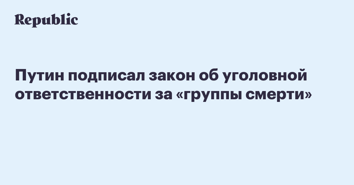 Президент России Владимр Путин подписал закон о введении уголовной ответственности за создание в соцсетях «групп смерти». Документ опубликован на официальном интернет-портале правовой информации.