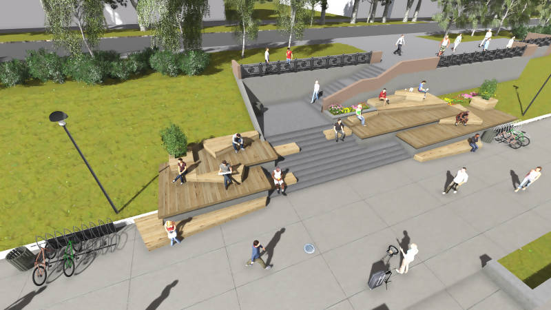 Предлагается «благоустроить участок неподалеку от памятника адмиралу Кузнецову: соорудить поверх гранитных ступеней и парапета деревянные настилы. На них будет удобно сидеть во время прогулок, будет место для парковки велосипедов, урны, декоративные деревья в специальных вазонах.»