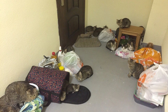 Как пишут местные жители в комментариях, такое количество котов оказалось в коридоре дома после того, как их владелица, которая собиралась снять квартиру в ЖК, получила отказ и поселилась в тамбуре.
