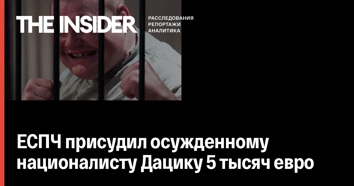Европейский суд по правам человека удовлетворил жалобу националиста Вячеслава Дацика на условия содержания в камере заключения и присудил осужденному 5 тысяч евро. Об этом сообщает «Фонтанка.ру» со ссылкой на его адвоката Андрея Федоркова.