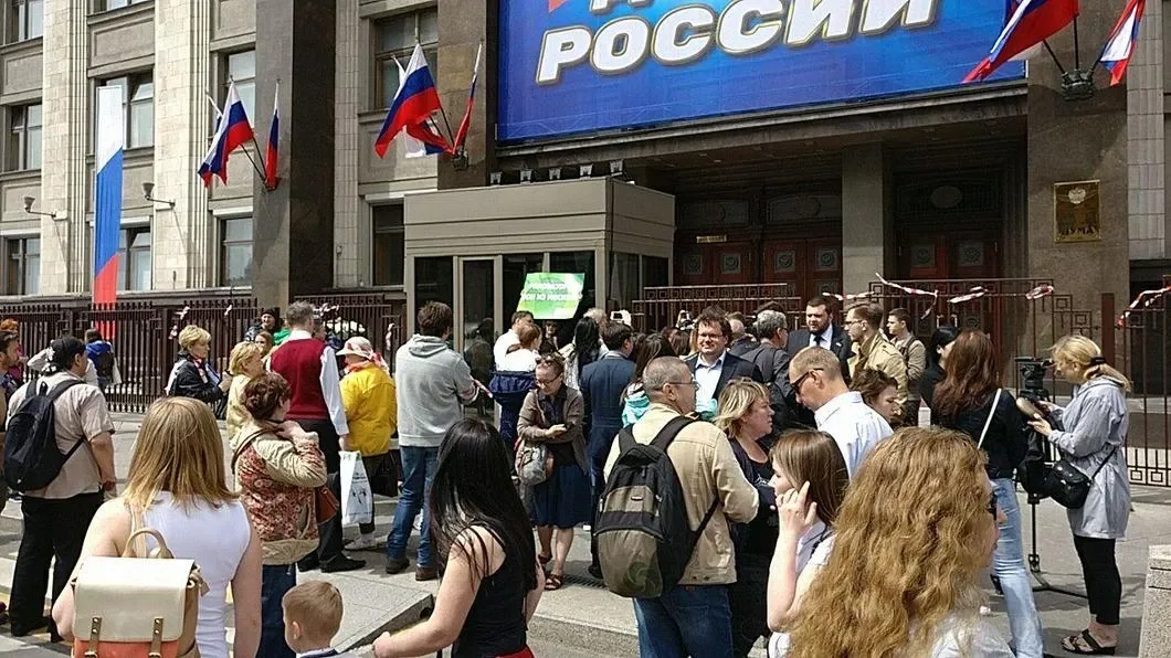 В пятницу, 9 июня, в Госдуме во втором чтении рассматривается законопроект о реновации жилфонда Москвы. У здания собрались противники реновации.