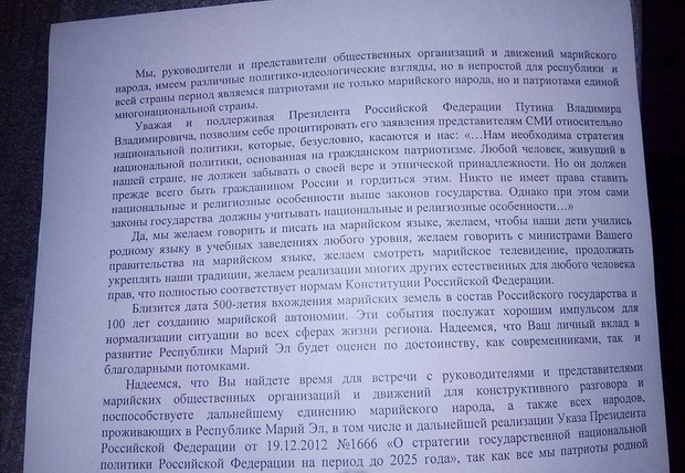 Особый интерес в документе представляют вот такие строки — фактически здесь очерчен тот самый татарстанский идеал (который, надо признать, и в Татарстане-то не воплощен в жизнь до конца): «Мы желаем говорить и писать на марийском языке, желаем, чтобы наши дети учились родному языку в учебных заведениях любого уровня, желаем говорить с министрами Вашего правительства на марийском языке, желаем смотреть марийское телевидение… » и т.д.