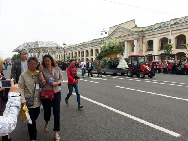 Надо признать, было богато, как в советском ресторане с крахмальной скатертью и пышногрудой хамоватой официанткой. Наверное, даже красиво. Смущало только, что после каждой игривой подводы с флорами, дриадами... шел военный оркестр. Вот именно в такой последовательности – букет, патриотический марш, букет, марш, букет… Слово РОССИЯ, кажется, из алых гвоздик, шириной в Невский, пронесли в полной тишине, зато когда в бравурную музыку затесался оркестрик с шотландскими волынками, народ начал радостно притопывать.