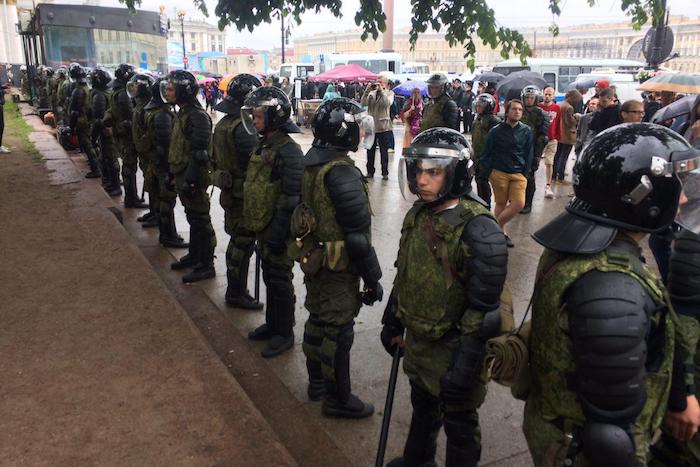 Около двухсот участников несогласованной с властями акции протеста против коррупции в России дошли с Марсова поля до Дворцовой площади. Вход на площадь со стороны набережной был перекрыт Росгвардией, поэтому люди вошли на Дворцовую через арку Главного штаба.