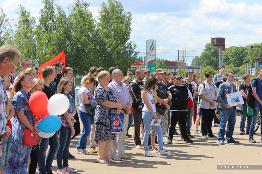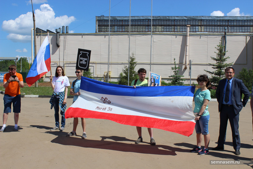 Двое волонтеров развернули большое полотнище со старым (до 2010 года) государственным флагом Марий Эл. В руках державшего полотнище молодого человека был еще и плакат с изображением банки с надписью «Компот не ответ».