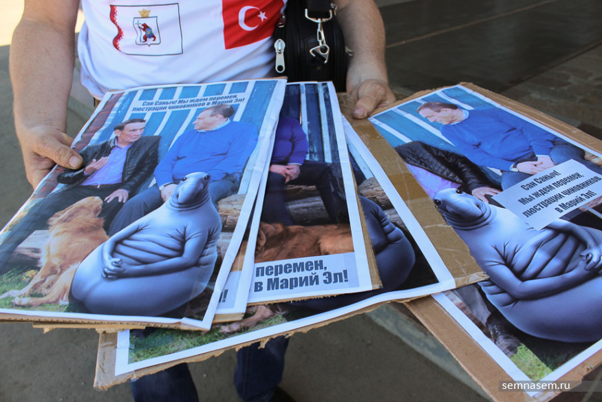 Волонтеры и некоторые из пришедших держали в руках плакаты. На большинстве из них был изображен Ждун [интернет-мем, символизирующий ожидание], беседующий с временно исполняющим обязанности губернатора Марий Эл Александром Евстифеевым и первым президентом республики Владиславом Зотиным. «Сан Саныч! Мы ждем перемен, люстрации чиновников в Марий Эл!» — было написано на плакатах.