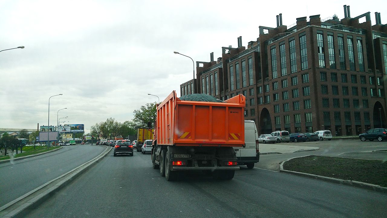 Когда мы с Рисовым едем в машине по Петербургу на встречу с одним из водителей, мимо нас постоянно проезжают здоровенные самосвалы с горами песка. «Это двадцатикубовый самосвал, — показывает Рисов на одну из машин. — Если такой самосвал заполнен даже наполовину — он уже перегружен».