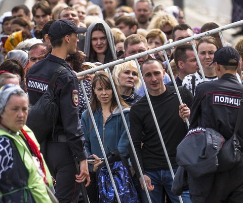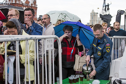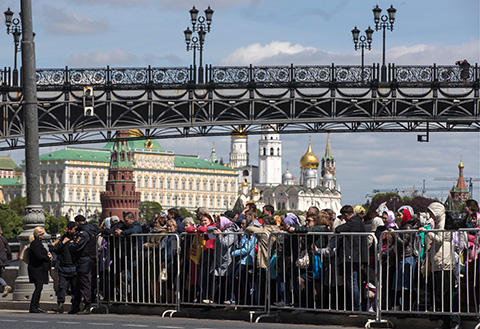 На «Кропоткинской» объявляют: «Очередь в храм Христа Спасителя от станции “Парк культуры”». Но оказывается, еще дальше — от Министерства обороны на Фрунзенской набережной. До храма Христа Спасителя отсюда почти три километра. Впрочем, на этом отрезке очереди как таковой нет — есть лишь рамки, за которые можно пройти. 27 мая, суббота, половина второго, народ еще, видно, только собирается.