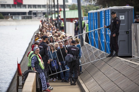 Вдоль набережной расставлены палатки с пирожками и водой, туалетные кабинки. В кабинках относительно чисто, вот только бумага повсюду закончилась. Вдоль рамок дежурят ОМОН, МЧС, полиция, попадаются православные волонтеры в салатовых нагрудниках. По реке плывут прогулочные катера. Многие останавливаются, чтобы сфотографировать их.
