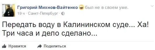 «Сын Александра Галича Григорий Михнов-Вайтенко стоял (сесть было негде) в Калининском суде, звонил мне, передавал воду внуку Бориса Стругацкого и ждал, когда суд вынесет решение (Боре — двое суток ареста и 15 тысяч штрафа). Нарочно не придумаешь. О великая русская литература...», — написал он на своей странице в фейсбуке.