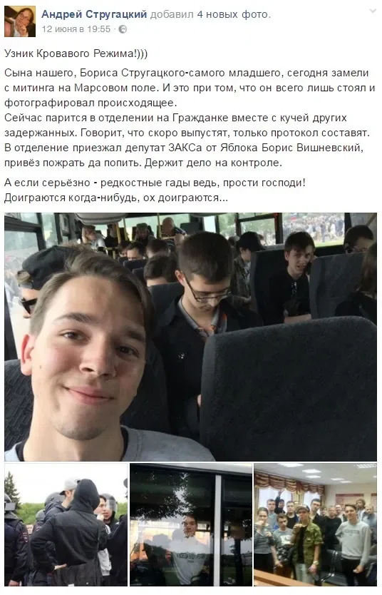 Отец Бориса, Андрей Стругацкий, пояснял в фейсбуке, что его сын всего лишь стоял и фотографировал митинг на Марсовом поле.
