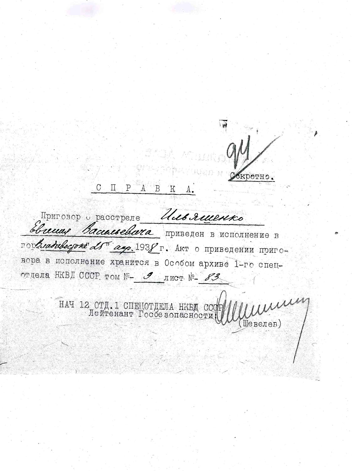 Репрессивная советская власть находила формальные поводы для расстрелов. "Контрреволюционный заговор", "шпионаж", "диверсия" – это лишь малая часть мифических причин, которые могли перечеркнуть жизнь любого человека во времена сталинской тирании. По сегодняшний день ответы на вопрос "За что?" разыскивают в архивах потомки людей, пострадавших во времена Большого террора. 15 января 1938 года Евгения Ильяшенко арестовали по обвинению в участии в "троцкистской группировке". На тот момент он проживал во Владивостоке. 25 апреля того же 1938 года суд вынес приговор: 10 лет без права переписки за участие в "троцкистской группировке".