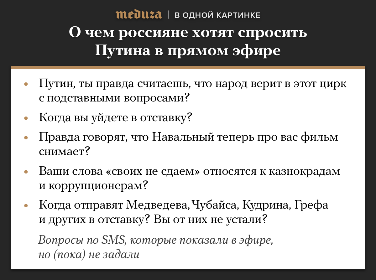 В эфире «прямой линии» показывают вопросы, которые вряд ли зададут Путину. Вот они