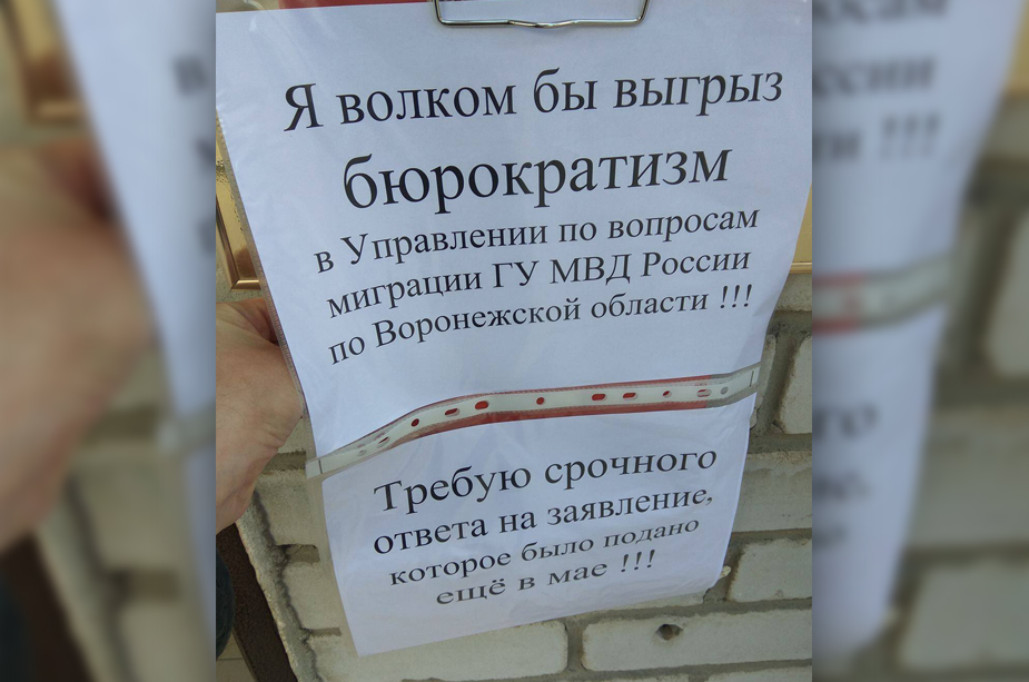 Правозащитник Илья Сиволдаев 14 июня вышел на одиночный пикет к зданию управления по вопросам миграции МВД по Воронежской области. Он протестовал против бюрократизма в работе полиции, это помогло ему получить ответ на запрос по делу его подзащитной. Об этом он рассказал корреспонденту «7x7».