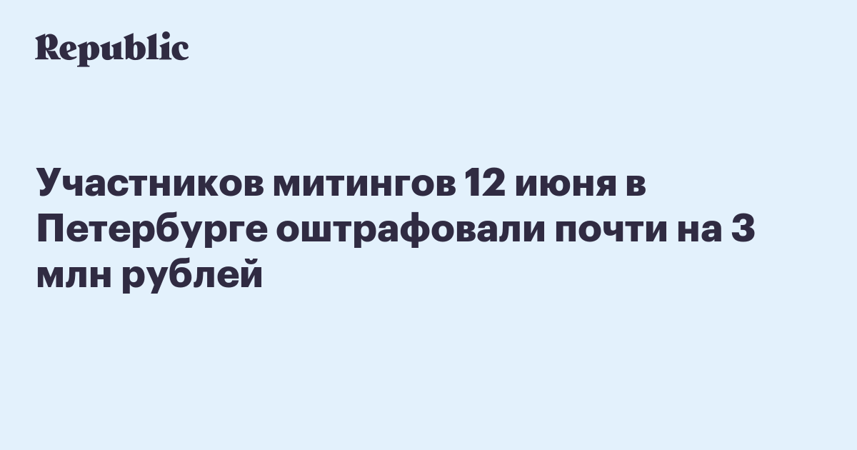 «ОВД-Инфо» подсчитал, что участников акций 12 июня в Санкт-Петербурге суммарно оштрафовали на 2,8 млн рублей. Об этом сообщается на сайте издания.