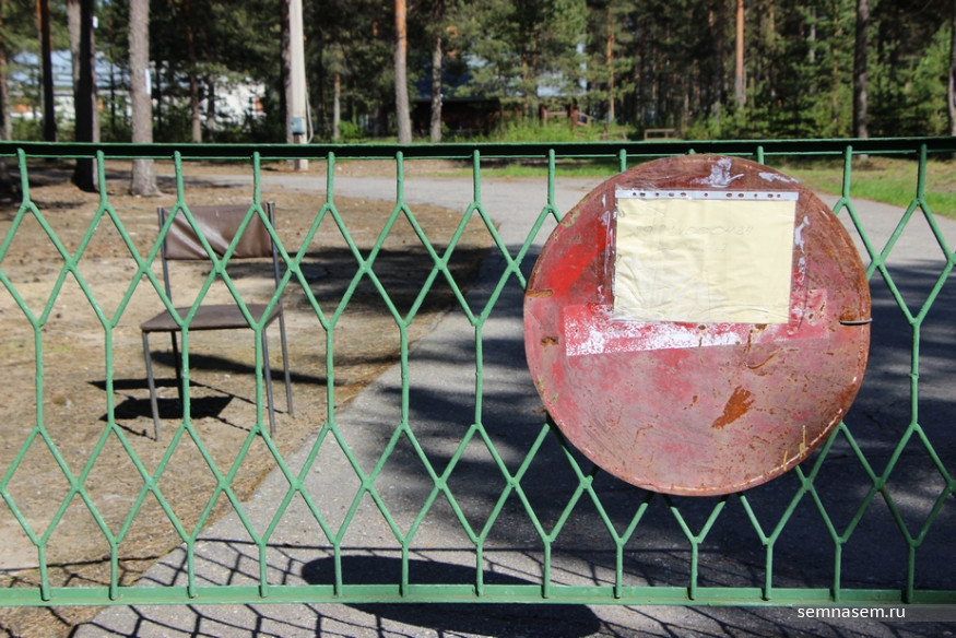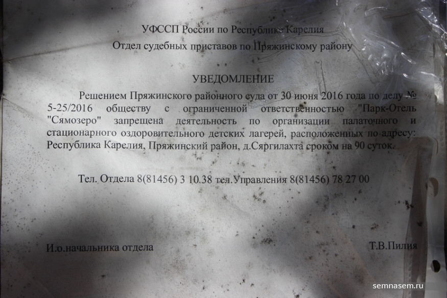 Парк-отель «Сямозеро» или лагерь «Карелия Open» сегодня своему названию не соответствует. На приветственной табличке вывешены бумаги с постановлениями о закрытии лагеря. На воротах — номер телефона охранника. По словам главы местного поселения Андрея Ореханова, на территорию никого не пускают, известно лишь, что оттуда постепенно вывозят все вещи.