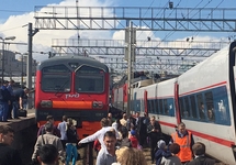 Инцидент произошел в 14:38 понедельника. По предварительной информации, при отправке электрички колесные пары двух вагонов сошли с рельсов. Вагоны накренились и задели подъезжавший "Стриж".