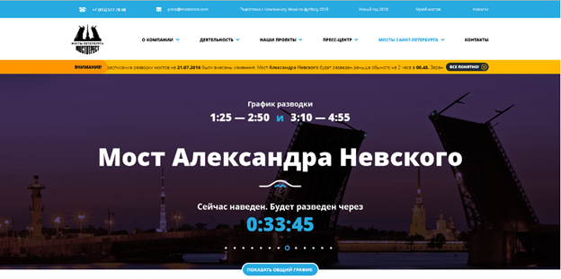 «Мостотрест» запустил сервис, информирующий о разводке мостов в режиме реального времени. На сайте можно узнать, сколько времени осталось до разводки моста, будет ли этой ночью промежуточная сводка и в каком состоянии находится мост в данный момент.