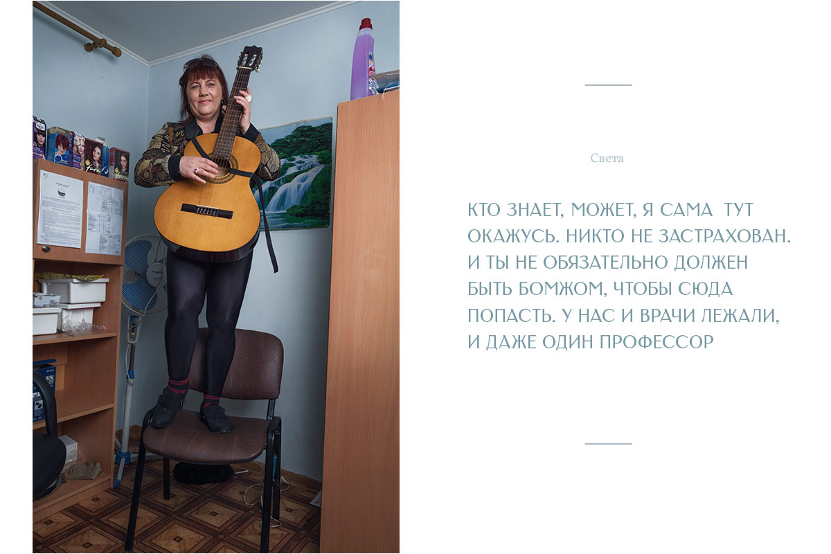 Светины шутки и смех слышны по всему коридору. Света — парикмахер. Сначала была санитаркой, потом перешла в парикмахерскую. Оклад 5100, этого не хватает на жизнь, поэтому взялась подрабатывать уборщицей. Работы много, устает.