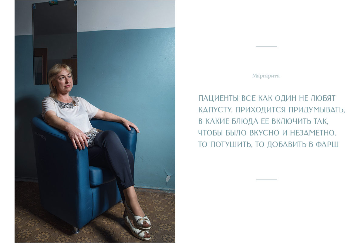 Максим Мармур для «ТД» Пациенты все как один не любят капусту. Поэтому Маргарита придумывает, в какие блюда ее включить так, чтобы было вкусно и незаметно. То потушит, то добавит в фарш. Больше всего подопечные Маргариты любят мясо и курицу, булочки и фрукты. Два раза в месяц полагается сладкое: конфеты, печенье, пряники и вафли. Маргарита старается совместить это с каким-нибудь праздником. Маргарита в диетпитании уже 26 лет. В доме-интернате работает два с половиной года, работать ей нравится. Оклад маленький, поэтому подрабатывает здесь же, в аптеке: выдает лекарства. Дочка учится в институте, нужно крутиться.
