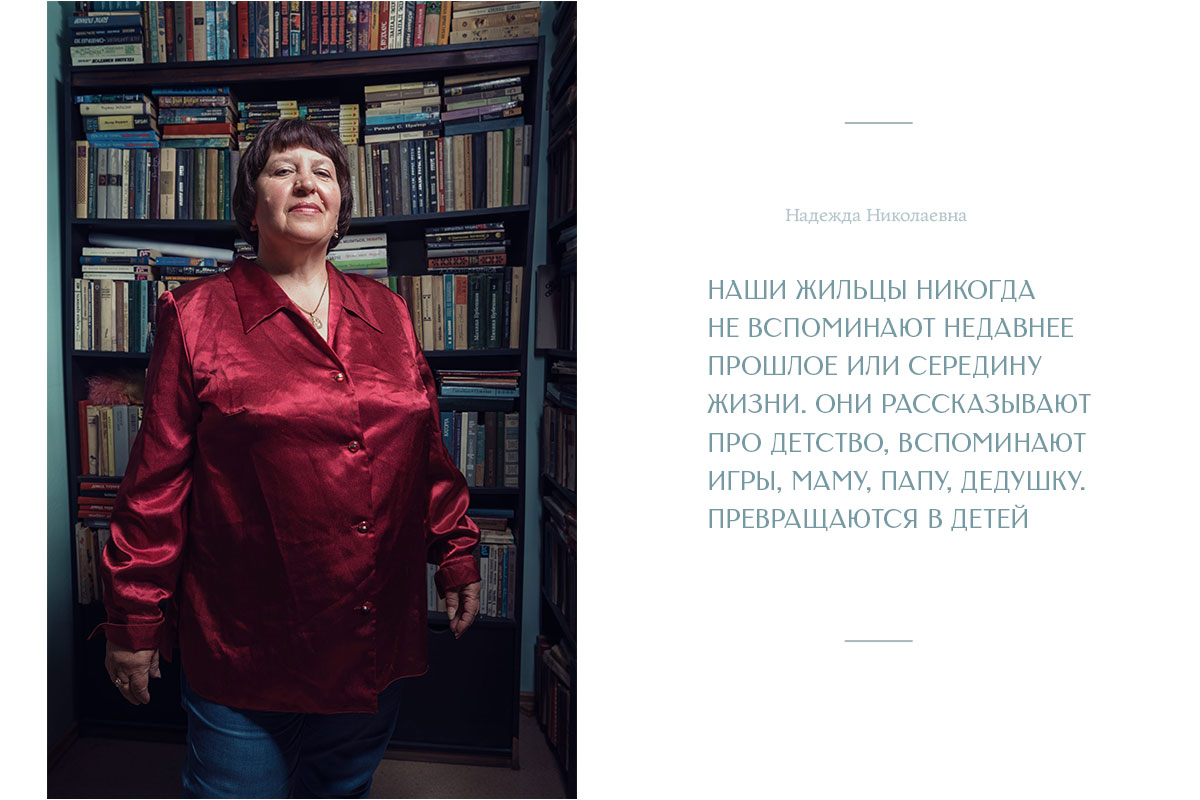 У многих нарушена психика, с ними тяжело. Странно, но наши жильцы никогда не вспоминают недавнее прошлое или середину жизни. Они рассказывают про детство, вспоминают какие-то игры, маму, папу, дедушку. Превращаются в детей. Многие по-новому оценивают своих родителей. Говорят, мол, если бы была мама жива, я бы все сделал по-другому. Несмотря на то что у меня библиотека, а не кабинет психолога, каждый день приходится с ними разговаривать об их проблемах и болезнях. И об их детстве».