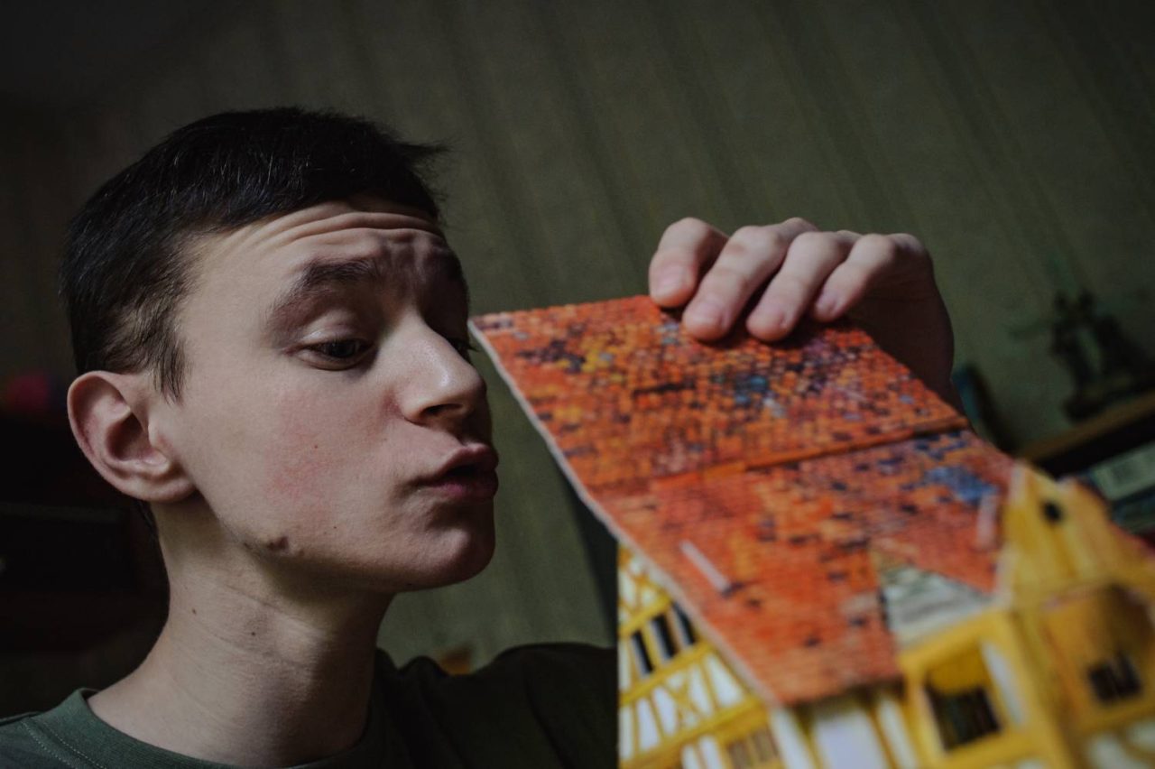 Виталий смотрит на картонную модель дома, которую он собрал вместе с мамойФото: Андрей Любимов для ТД Сейчас Виталик с гордостью показывает свои поделки: свалянную из шерсти белую овечку, вручную собранную картонную ветряную мельницу, даже золотую медаль, полученную за организованную волонтерами хосписа выставку его работ. Но это сейчас.