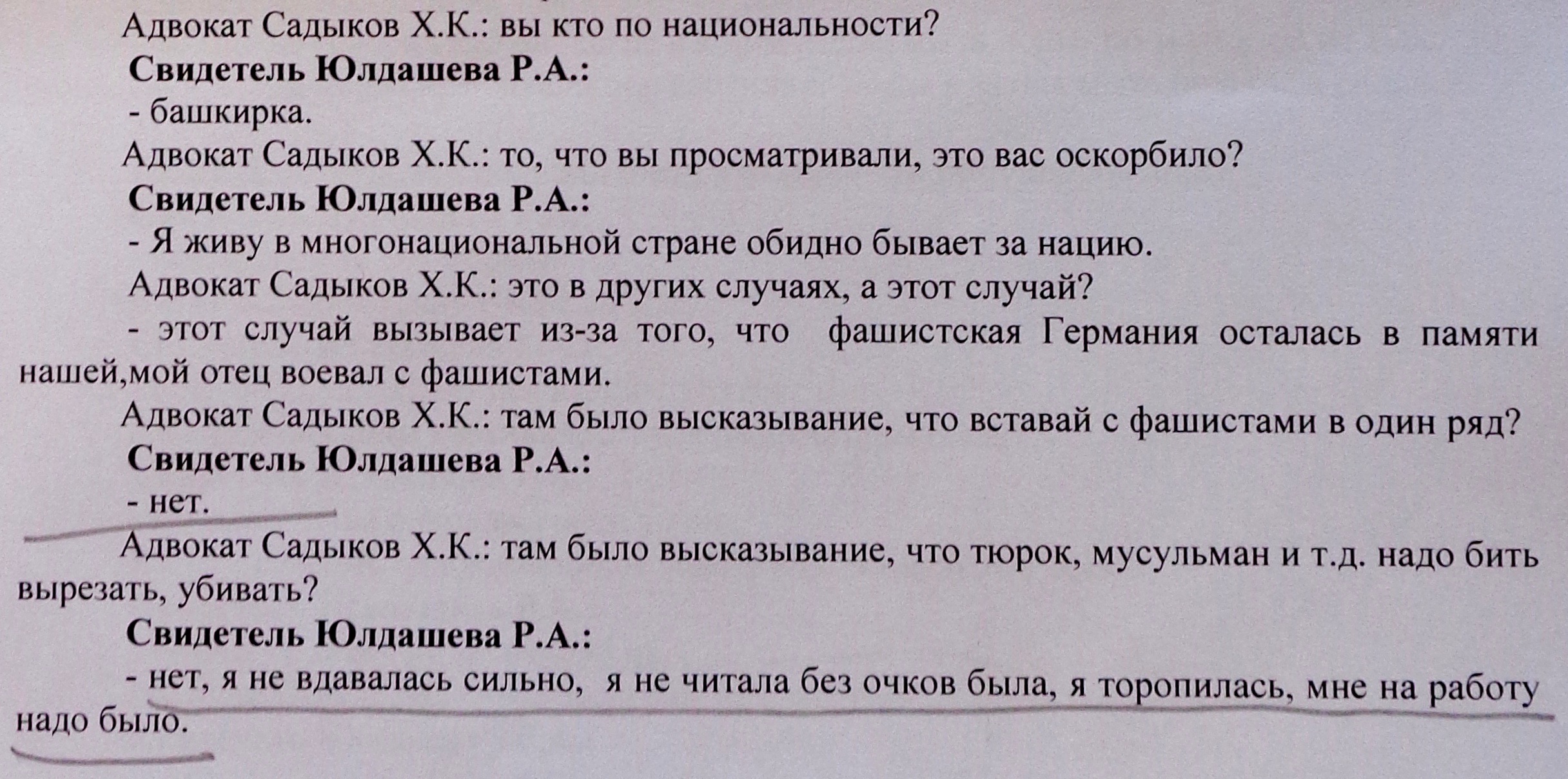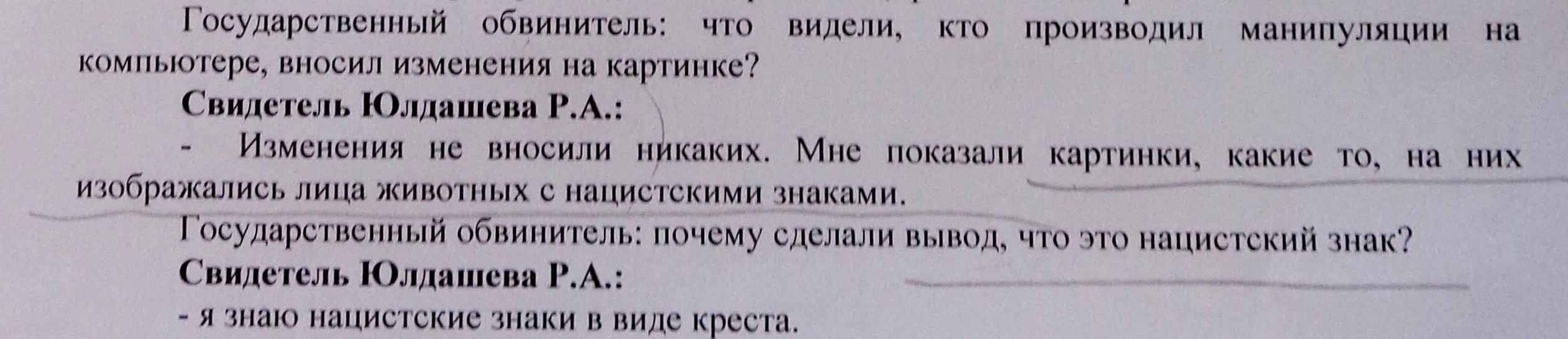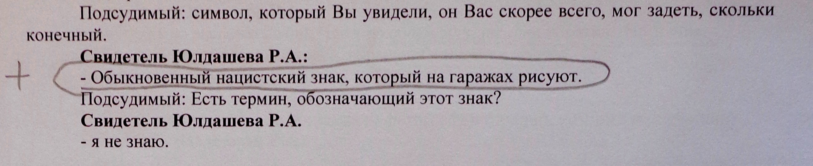 По словам Юлдашевой, она торопилась вернуться к работе, к тому же у нее не было с собой очков, поэтому в содержание предъявленных ей материалов она «не вдавалась сильно». Запомнила понятая только имя юноши и «нацистский знак», который ей показали на странице блогера в соцсети — в какой именно, она тоже не запомнила, но уверена, что это были не «Одноклассники».