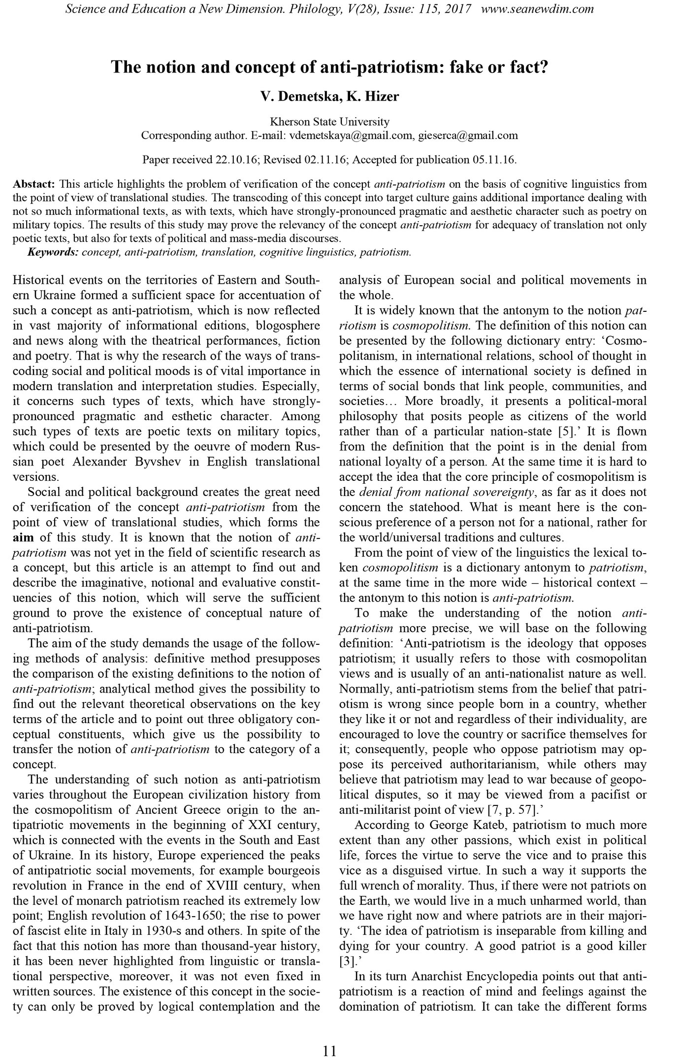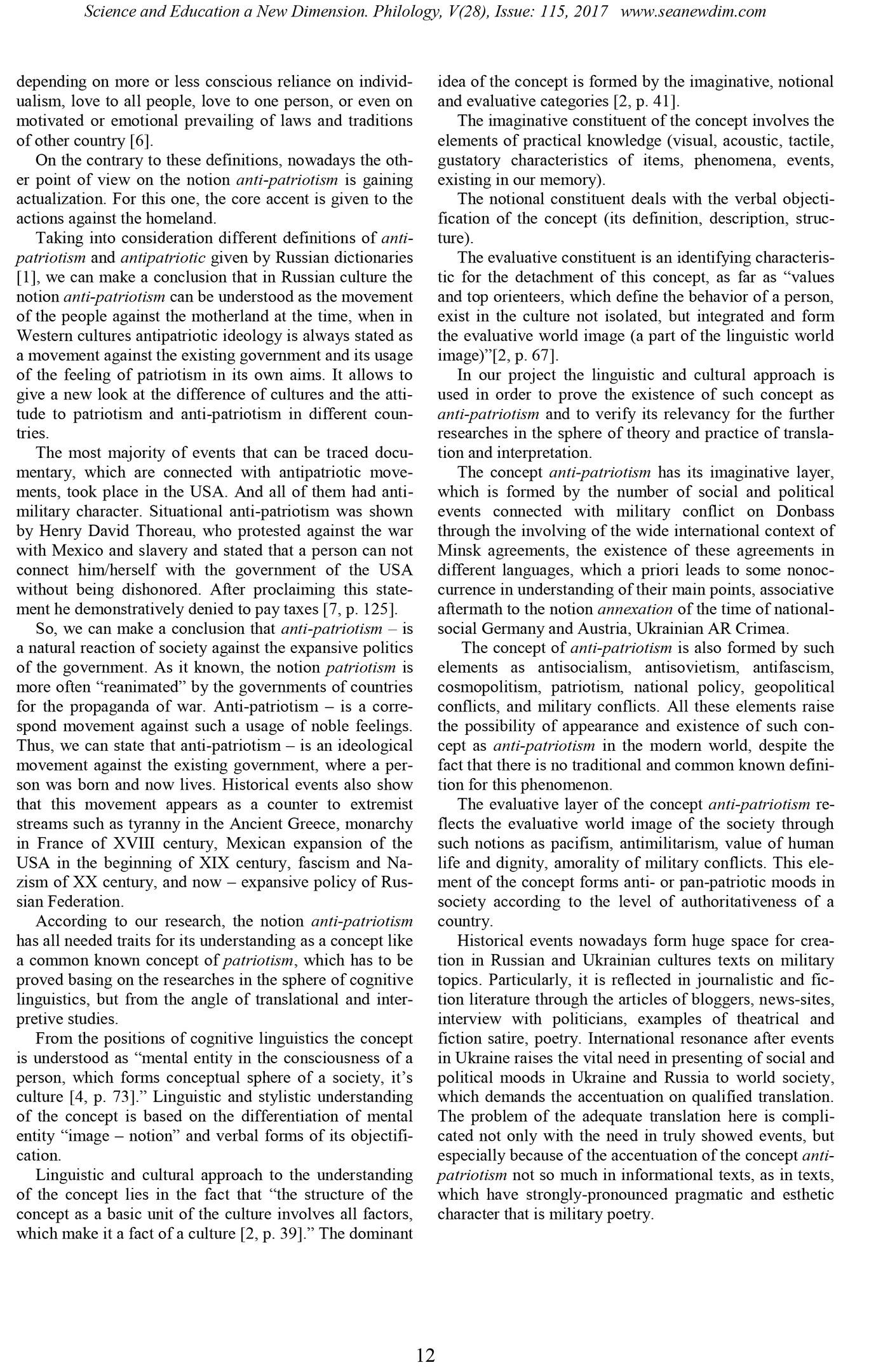 Недавно в в международном научном журнале «SCIENCE and EDUCATION a NEW DIMENSION», издающемся в Будапеште, в разделе "Филология" была опубликована статья "The notion and concept of anti-patriotism: fake or fact?" ("Понятие и концепт АНТИПАТРИОТИЗМ: фейк или факт?") Мне особенно лестно, что авторы данного исследования доктор филологических наук, профессор, зав. кафедрой переводоведения и прикладной лингвистики V. Demetska (В. Демецкая) и K. Hizer (К. Гизер) ссылаются на моё творчество. Вот цитата из этой статьи (даю на языке оригинала):