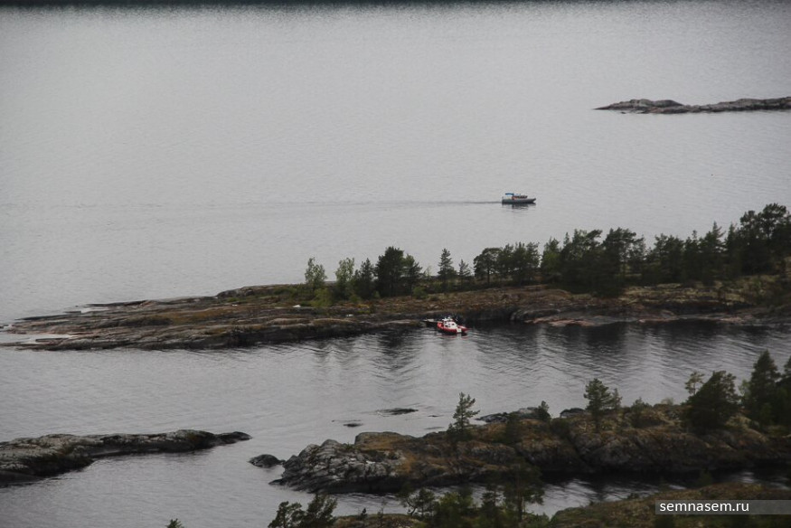 В 15:30 взлетает вертолет. На борту — журналисты. С воздуха виден масштаб поисков — МЧС обследует две губы: береговую линию, территорию вокруг островов, водную поверхность. Озеро усеяно катерами. Через 20 минут возвращаемся в бухту. По-прежнему никакой информации. Пропавших не нашли.