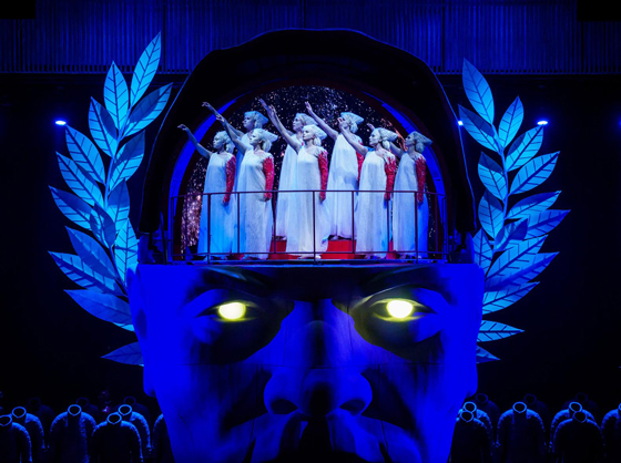 © Андрей Безукладников Авторитетная голландская газета NRC Handelsblad назвала музыку Дмитрия Курляндского «опьяняющей». Избавление от опьянения властью — сверхсюжет полуторачасового спектакля, устроенного как сеанс врачевания мозга тирана: в самом начале «Октавии» по лбу истукана бежит лазерная строчка невидимого трепанатора. Хор безголовых воинов, поделенный на два отряда, мерно и почти невидимо копошится, издавая попутно звуки, похожие на стоны: каждого солдата терракотовой армии будут выдергивать из толпы по одному бодрые красноармейцы с винтовками и вести — беспомощных, слепых — на места, уготованные им историей. Спотыкающиеся гиганты, послушно ведомые вооруженной властью, на поклонах снимут свои костюмы — и перед залом предстанет разномастная толпа улыбчивых голландских артистов в футболках с собственными именами: утверждая свободу личности, этот заключительный жест окончательно превращает «Октавию» в подлинно открытый, интернациональный, фестивальный проект в лучшем смысле слова.