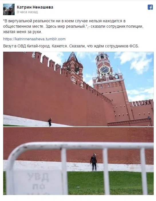 Полиция задержала художницу-акционистку Катрин Ненашеву на Красной площади в Москве за прогулку в очках виртуальной реальности. Об она сообщила на своей странице в фейсбуке.