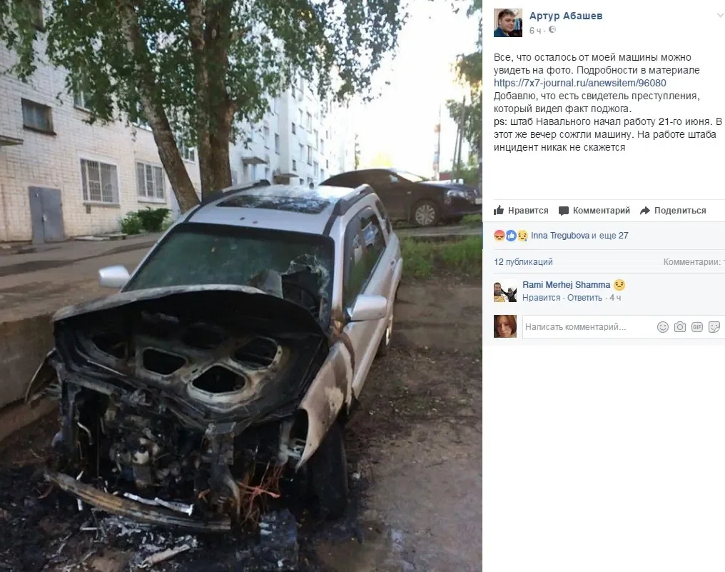 В Кирове сожгли автомобиль координатора штаба Алексея Навального Артура Абашева (он также является зампредседателя кировской Общественной наблюдательной комиссии). Это произошло в день открытия штаба, 21 июня.