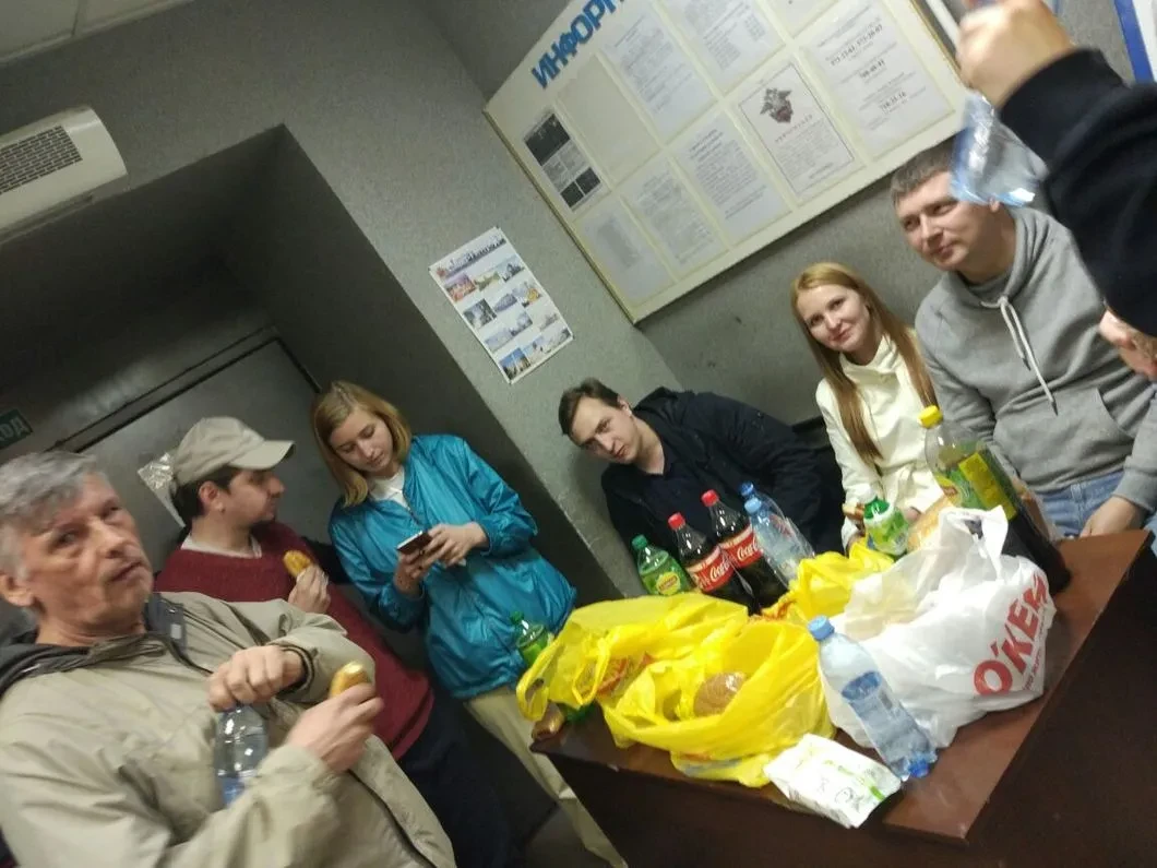В полиции задержанных не кормили. Люди приободрились, только когда волонтеры привезли печенье, булочки, воду, холодный чай и кока-колу. Тут Эвелина и сфотографировала их группу «на память».