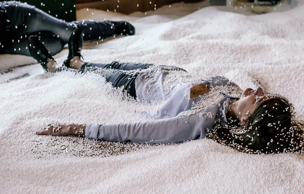 Зрители заходят в пространство небольшими группами. Нам — первой группе из пяти человек — наклеивают на грудь строительную ленту с порядковым номером. Мне достается «161700». «Так сыр помечают или зэков в тюрьме», — улыбаются обклеенные в холле фабрики «Большевик». Тут же девчушка делает селфи. Я заглядываю через плечо: в кадр умещаются губы, грудь и наклейка на ней.