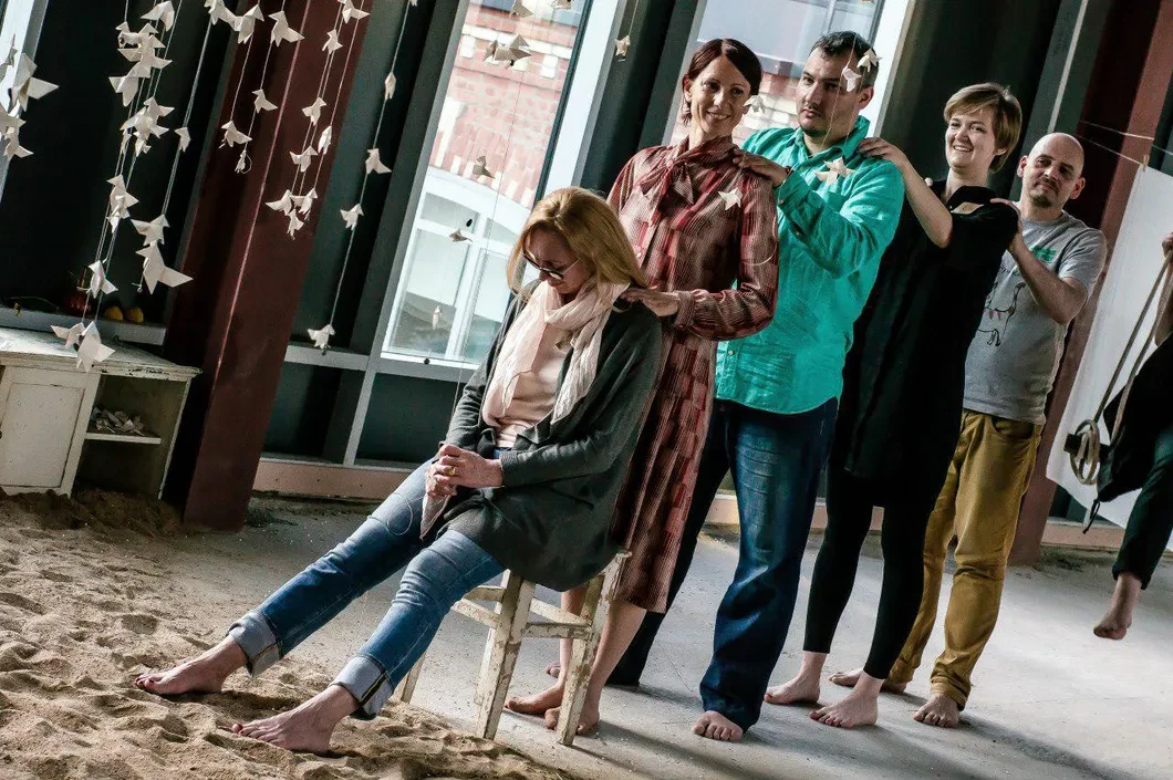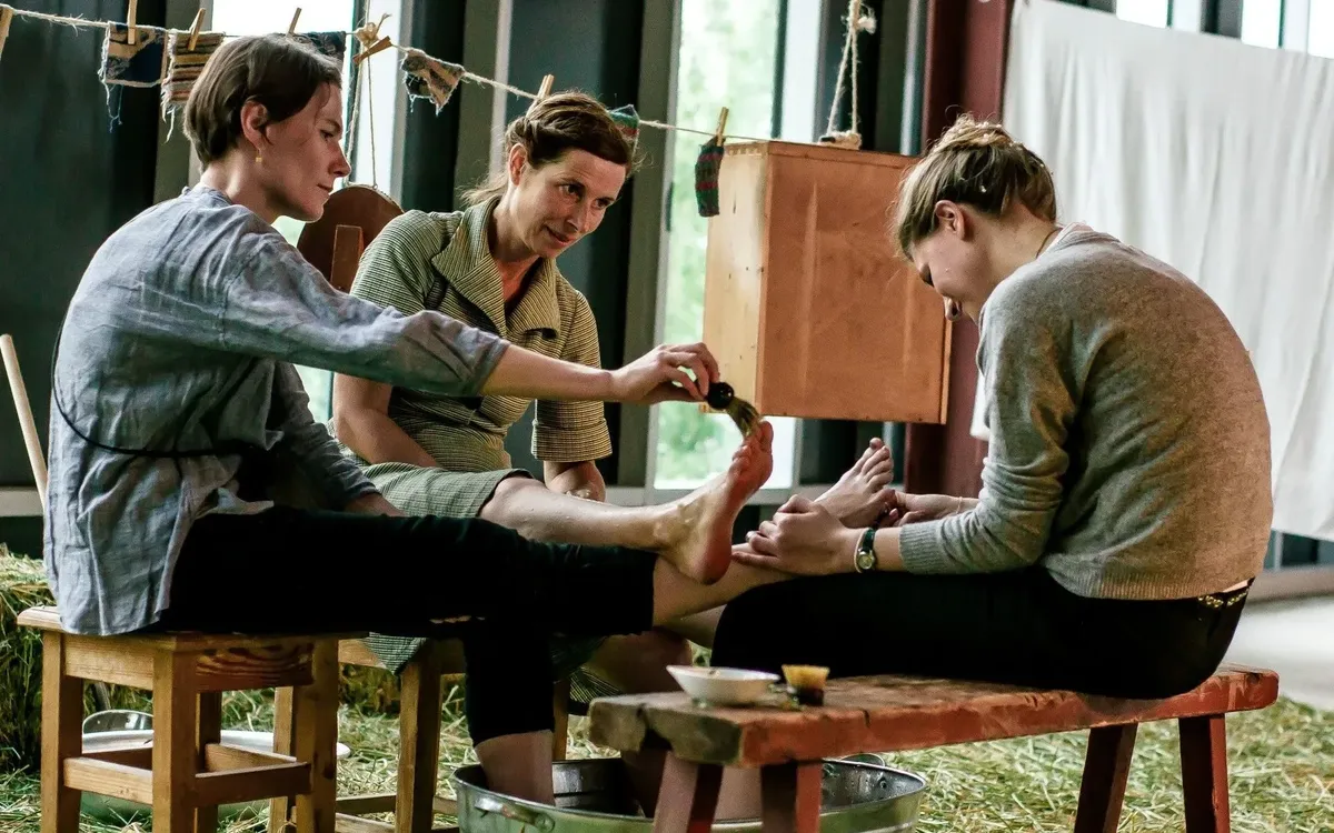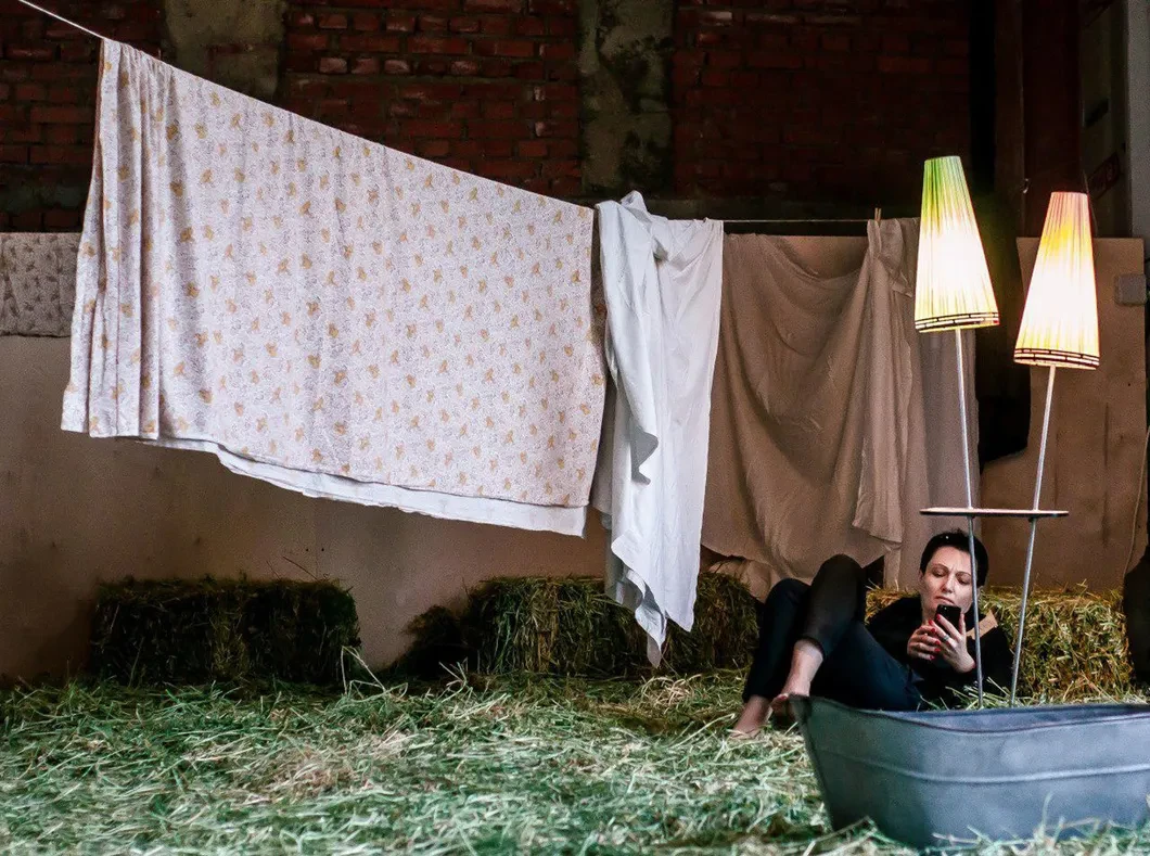 «Ну что, бабоньки?! Попаримся, как в русской бане?» — чтобы развлечь себя и публику, я с улюлюканьем опрокидываю на скрещенные голые ноги незнакомых мне людей половник с водой. Зрители и артисты поворачиваются. За белыми занавесками что-то вроде русского поля с баней посередине: застланный сеном пол, стога по периметру, керамическая ванна посередине и несколько тазов с табуретами. Примостившись на край ванны и прополоскав в ней ноги, протягиваю их соседу — пошкрябай щеточкой да насухо вытри, дружочек. Неловкость и даже брезгливость проходят мгновенно. «Хозяйка» подносит тарелку с кусочками лимона. «Эх, водочки не хватает!» — мечтательно протягиваю я.