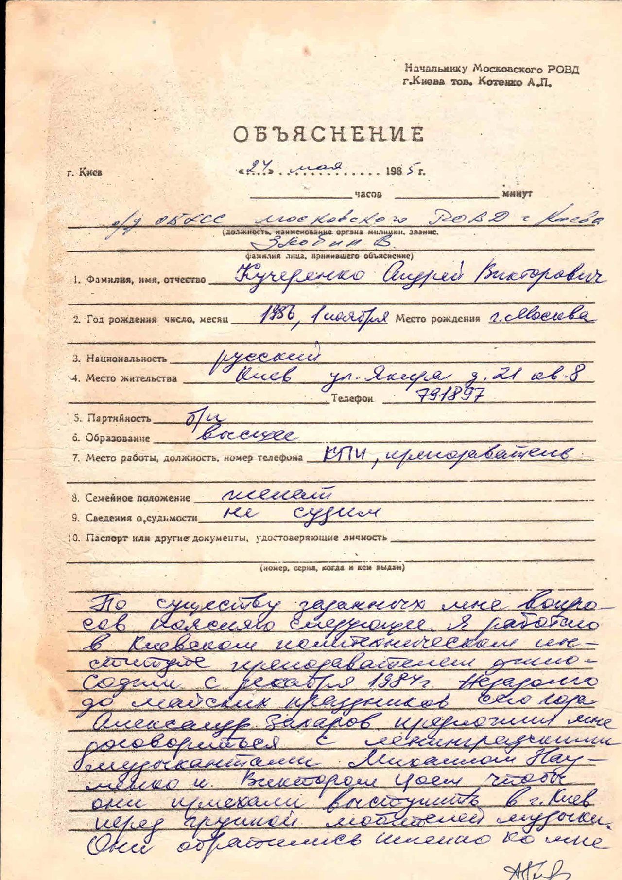Начальнику Московского РОВД г. Киева [от] Цой Виктора Робертовича, 1962 года рождения, уроженец г. Ленинграда, национальность русский, образование средне-специальное, б/п, работающего на ленинградском таро-ремонтном заводе № 1 в должности машиниста котельни, проживающий г. Ленинград, проспект Ветеранов 99 кв 101 тел. 1592845, не судим